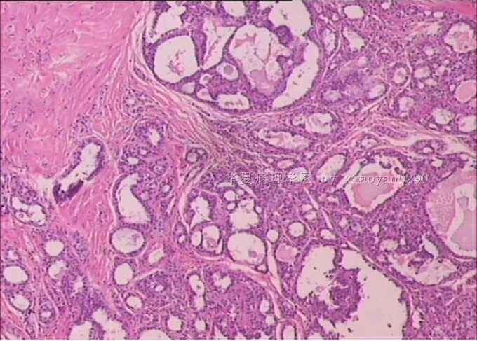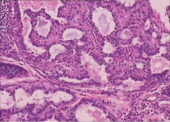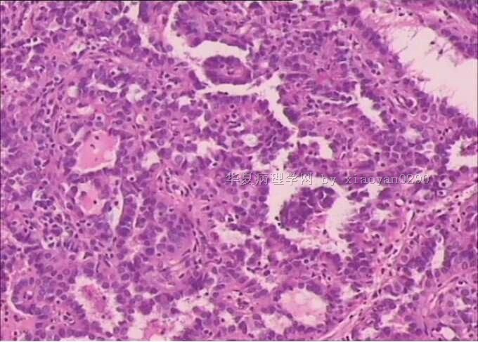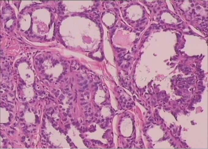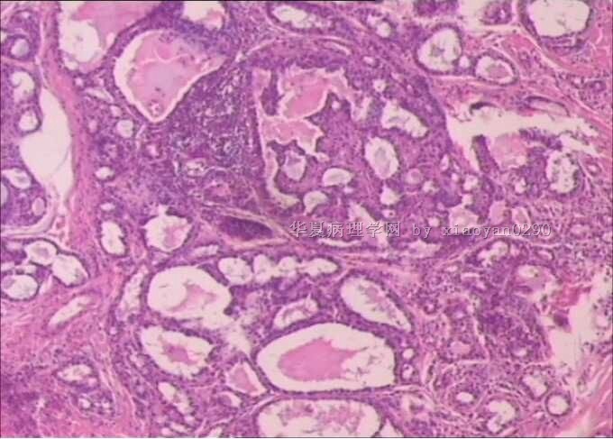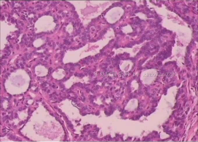 没有高倍,核特征看不出来,从低倍看,有乳头结构,核偏大也较密集,考虑乳头状癌。
