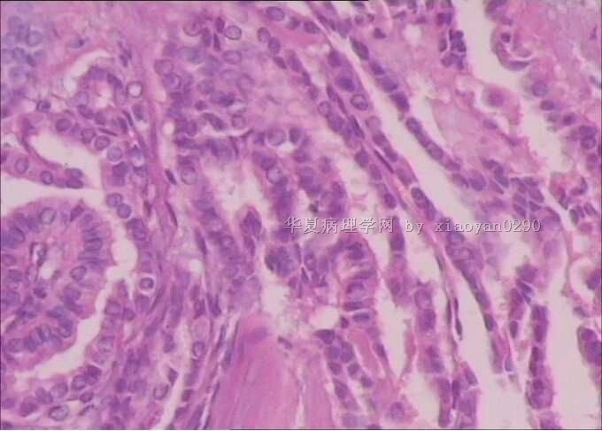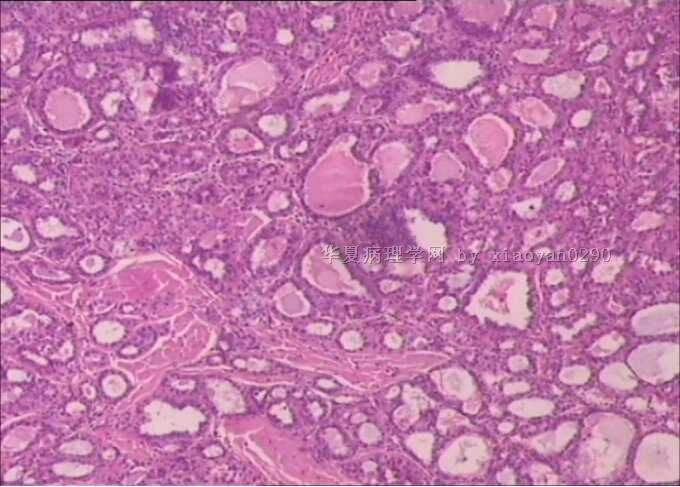 送检的左侧及右侧肿物均为结甲,良性病变。只是这一小块连接气管的一侧少部分呈现乳头样改变,其余部分也是正常的。最后一张图片不是这个病例的,不知道怎么删除。