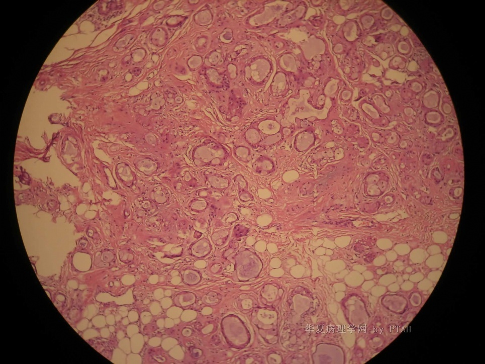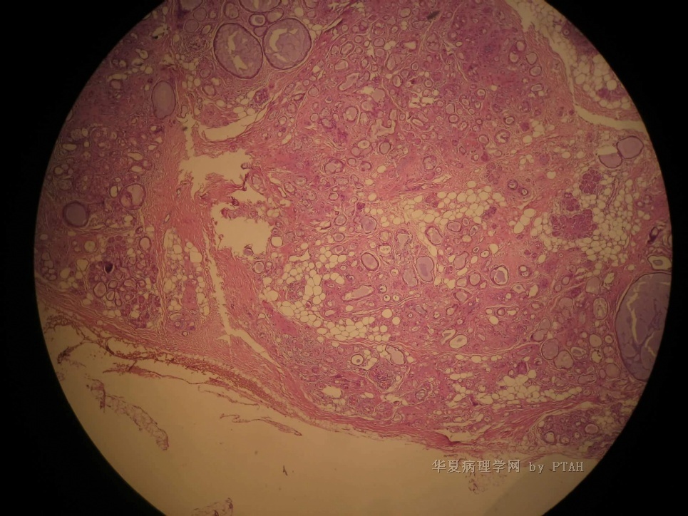 2)主要由扩张的导管结构和纤维性间质构成,致密纤维组织常围绕唾腺小叶和导管结构,保留有小叶的构筑;