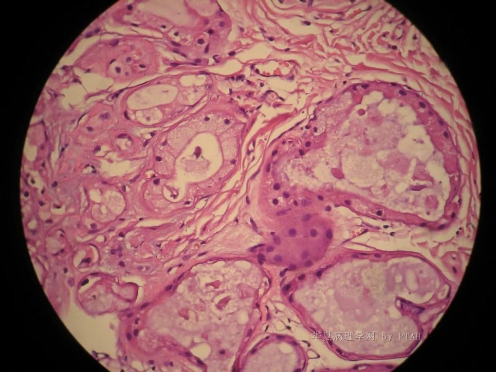 4)导管上皮具有不同的细胞形态表型:(1)大汗腺样;(2)腺泡状(细胞浆内含有嗜酸性颗粒,具有明显的核仁);(3)空泡状;(3)皮脂腺样。甚至有黏液样表观,胞浆偏碱性,等等;局灶可有鳞状化生;囊状扩张导管可现实囊内乳头状增生、细胞桥。有的显示显示筛状结构;腺体致密区和实性巢可显示细胞异型增生;