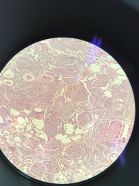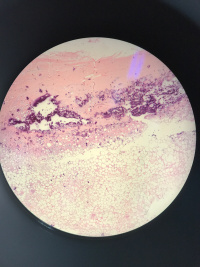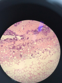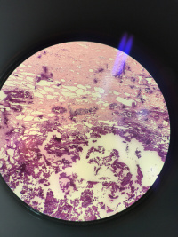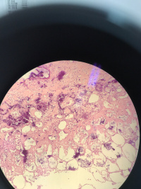 灰白灰黄色不规则组织一个,大小4.5x3x1.5cm,切面灰白灰黄色,部分似有钙化。
