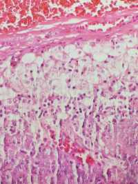 椭圆形灰粉淡黄组织一块,2.3×1.4×1.2cm,包膜完整,切面灰粉黑褐色,实性,质中